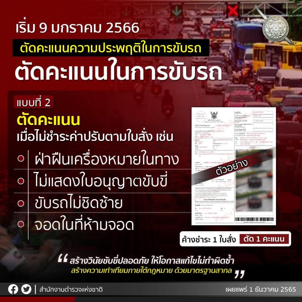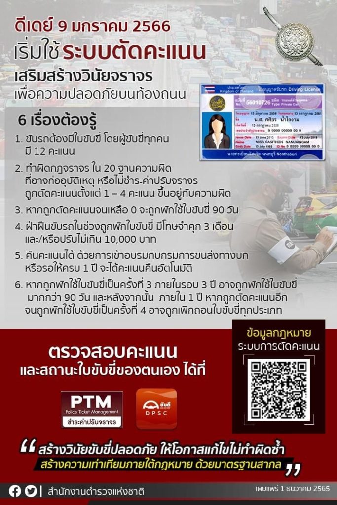 สำนักงานตำรวจแห่งชาติ โดย พล.ต.อ.ดำรงศักดิ์ กิตติประภัสร์ ผู้บัญชาการตำรวจแห่งชาติ (ผบ.ตร.) ประชาสัมพันธ์ระบบตัดคะแนนความประพฤติในการขับรถ หรือ ตัดแต้มใบขับขี่ เพื่อเสริมสร้างวินัยจราจร เป้าหมายเพื่อลดการเกิดอุบัติเหตุบนท้องถนน ซึ่งจะเริ่มบังคับใช้ในวันที่ 9 มกราคม 2566