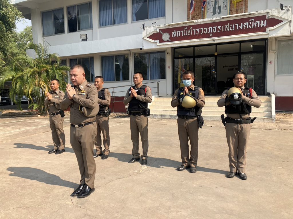 พ.ต.อ.ประสิทธิ์ วัรัตยาภรณ์ ผกก. สภ.เสนางคนิคม พร้อมด้วย ร้อยเวร20 สายตรวจรถยนต์ สายตรวจรถจักรยานยนต์ สิบเวร เจ้าหน้าที่ธุรการ เข้าแถว